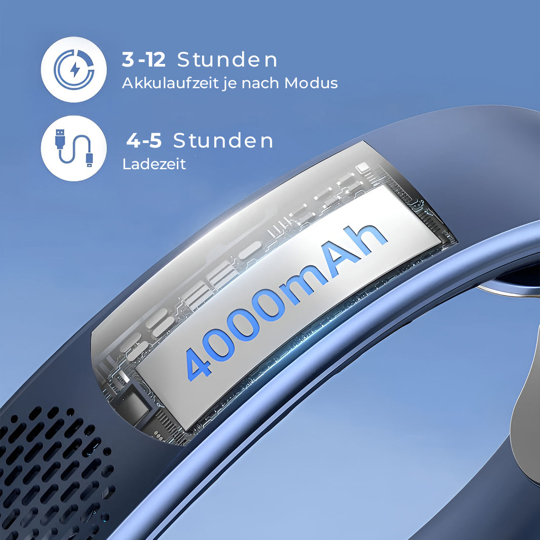 Airfo arbeitet flüsterleise mit unter 35 dB und stört weder dich noch andere. Der integrierte 4000 mAh Akku sorgt für bis zu 12 Stunden Laufzeit und ist per USB-C in nur 4 Stunden voll aufgeladen. So bleibst du überall cool – ganz ohne Kabel, Lärm oder Aufwand.